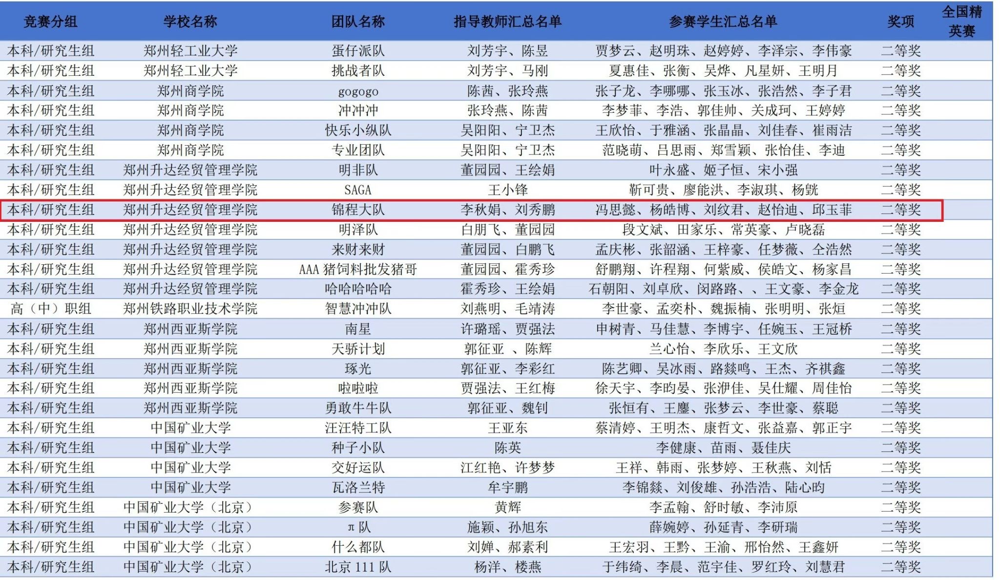 近期,2025年全国高校商业精英挑战赛各个赛道均落下帷幕,该比赛由中国国际贸易促进委员会商业行业委员会主办,其中的创新创业竞赛创业模拟赛道,共吸引全国本科组两千三百余支队伍参赛。2025年7月13日,在金融贸易学院国际贸易教研室李秋娟、刘秀鹏两位老师的指导下,经过激烈角逐,金贸学子荣获该赛道全国总决赛团体二等奖,团队成员有冯思懿、邱玉菲、赵伊迪、刘纹君、杨皓博。