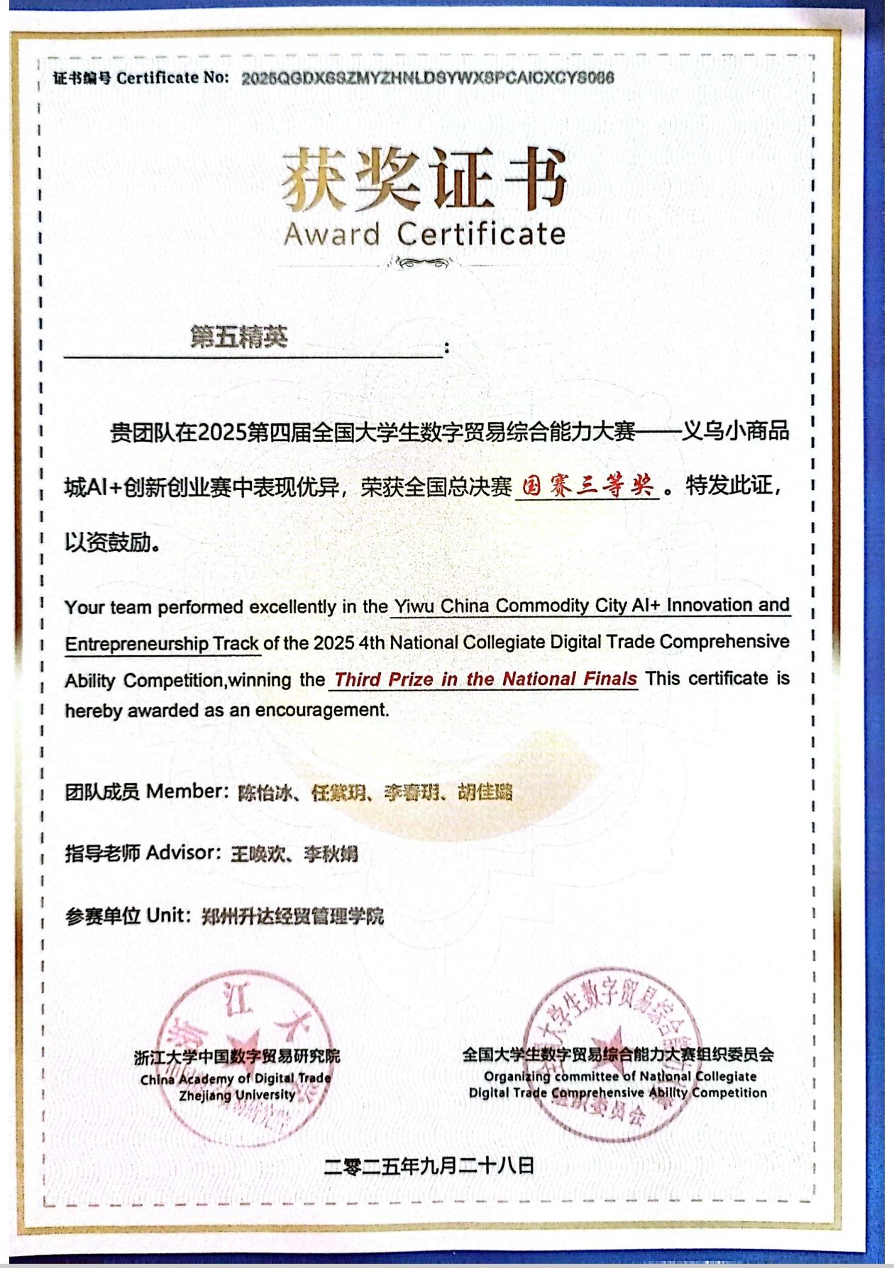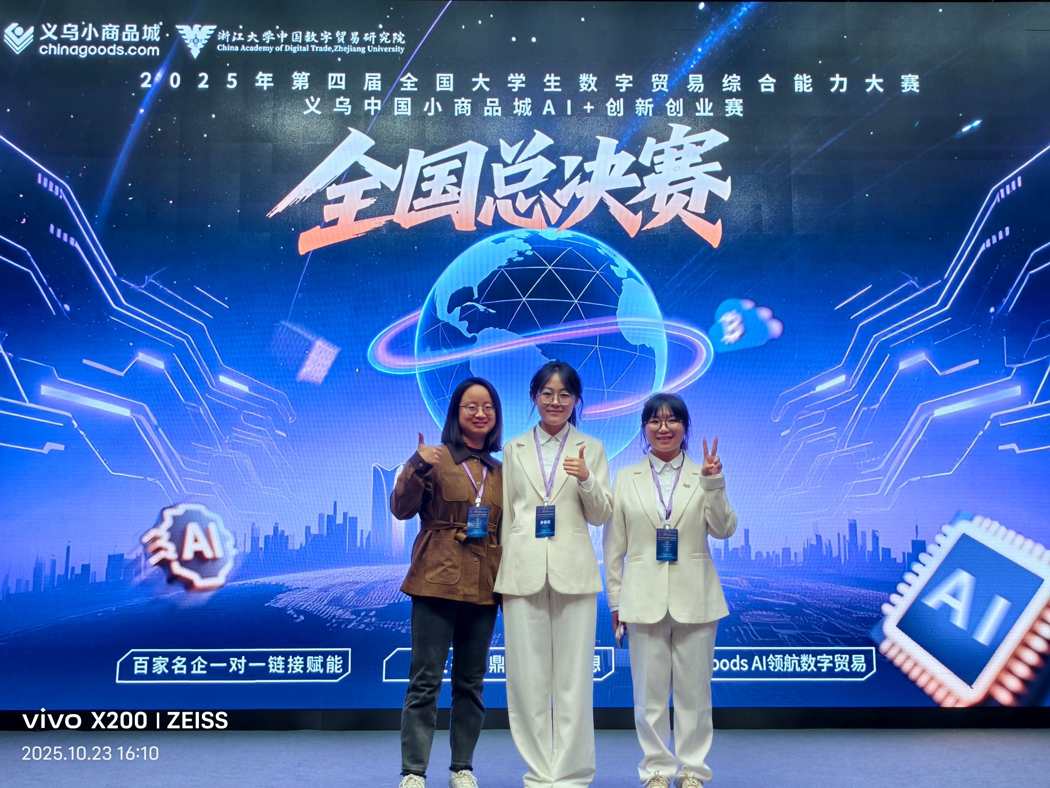 10月24日,第四届全国大学生数字贸易综合能力大赛-义乌小商品AI+创新创业赛道全国总决赛在浙江义乌落下帷幕。在王唤欢、李秋娟两位老师的指导下,金融贸易学院国际经济与贸易专业大二学生陈怡冰、任紫玥、李春玥、胡佳璐同学组成的第五精英队荣获国赛三等奖。
