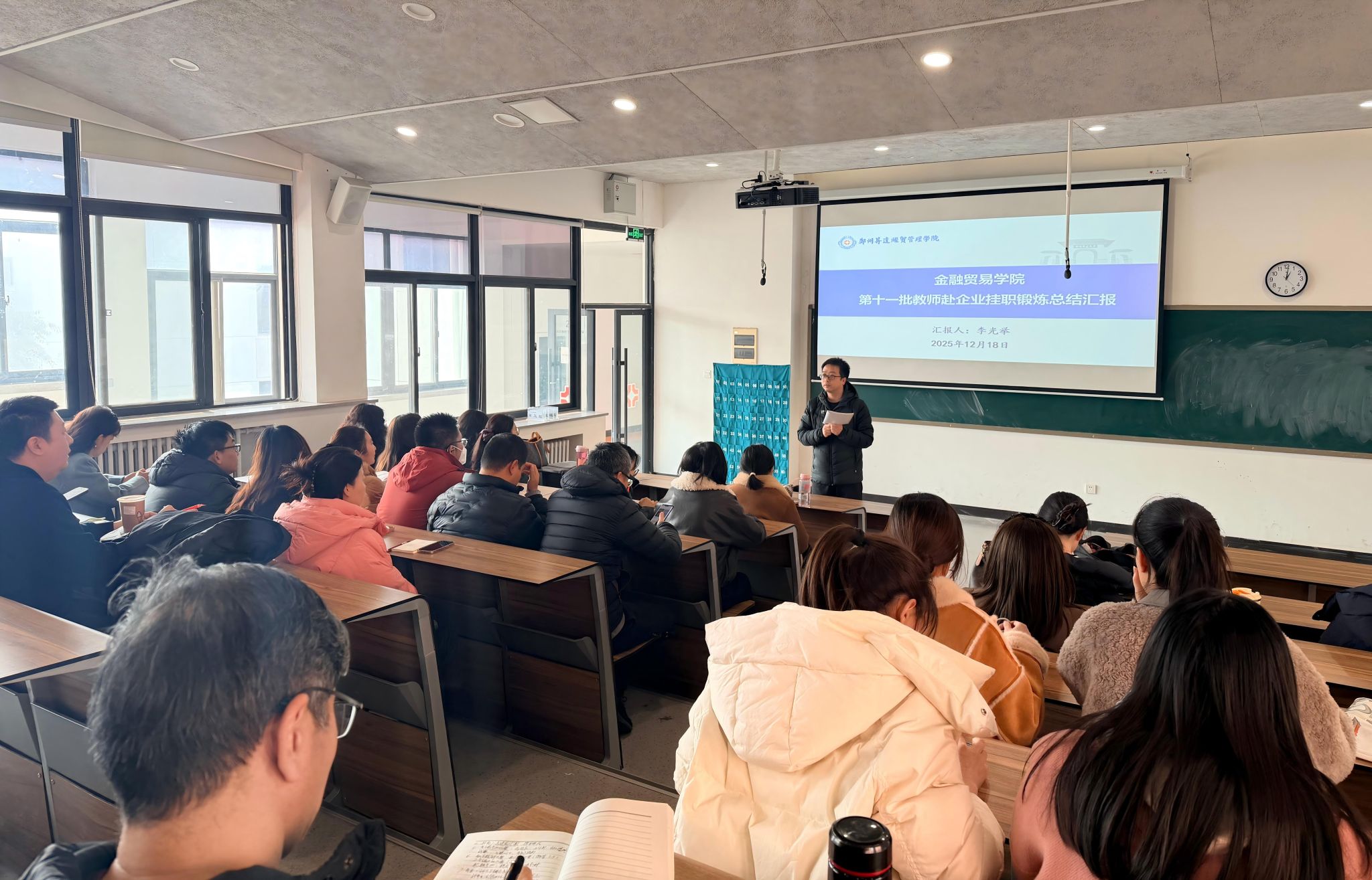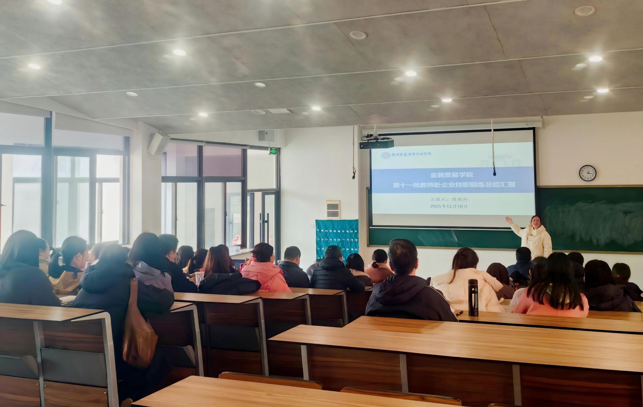 为深入贯彻应用型人才培养理念,持续提升教师实践教学能力与人才培养质量,2025年12月18日下午,金融贸易学院在教学三号楼210教室成功举办教师赴企业挂职锻炼总结汇报会。会议聚焦挂职实践成果分享、教学与产业对接融合等核心议题,陈艳玲、李光举两位老师先后分享了各自在企业一线的挂职经历、实践收获与教学思考。