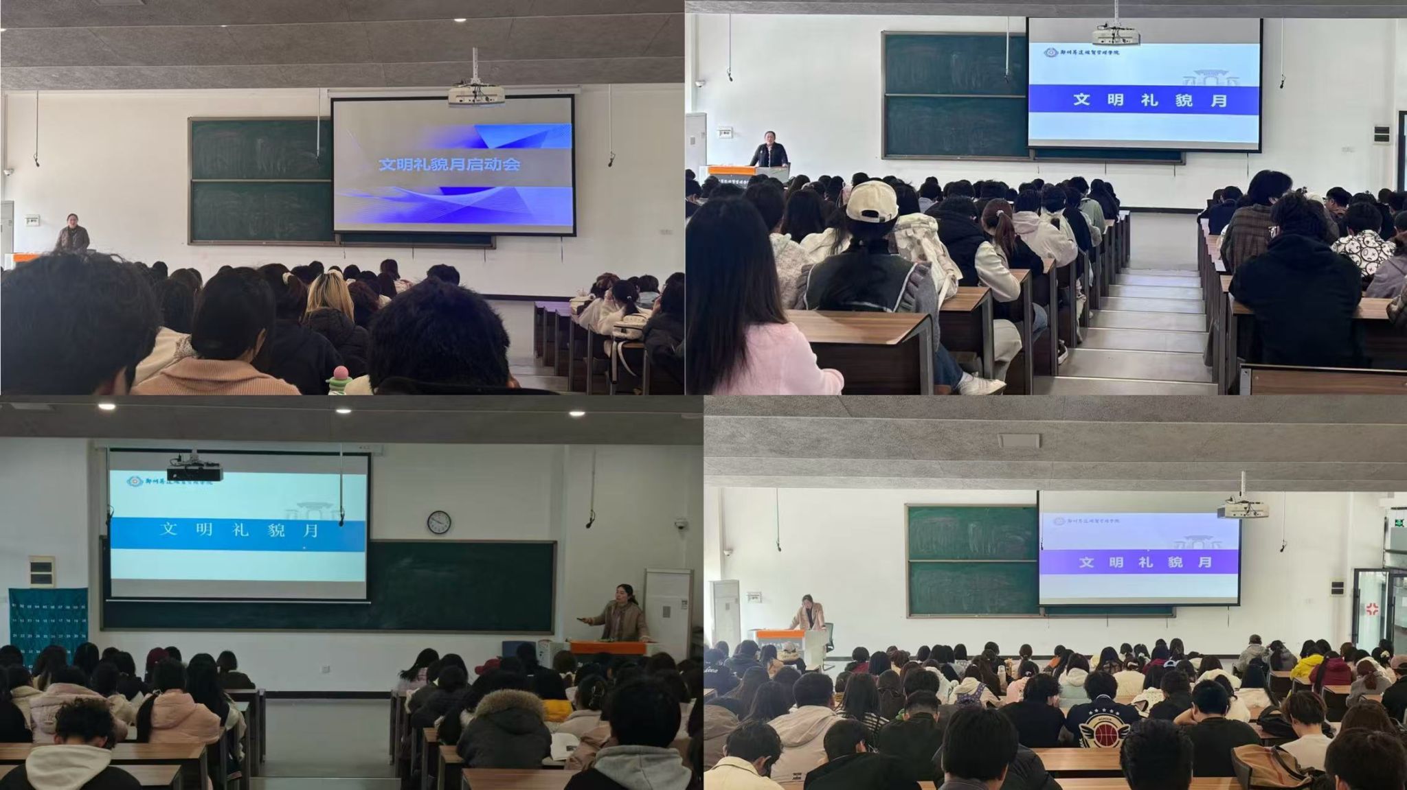 会后,学院辅导员组织召开主题班会,带领学生学习活动方案、完成班会记录并背书签名承诺,引导学生自觉践行文明规范。学院各班级同步开展宿舍安全自查、文明劝导等实践活动,并制作主题宣传展板进行集中展示,营造人人讲文明、处处守礼仪的浓厚氛围。