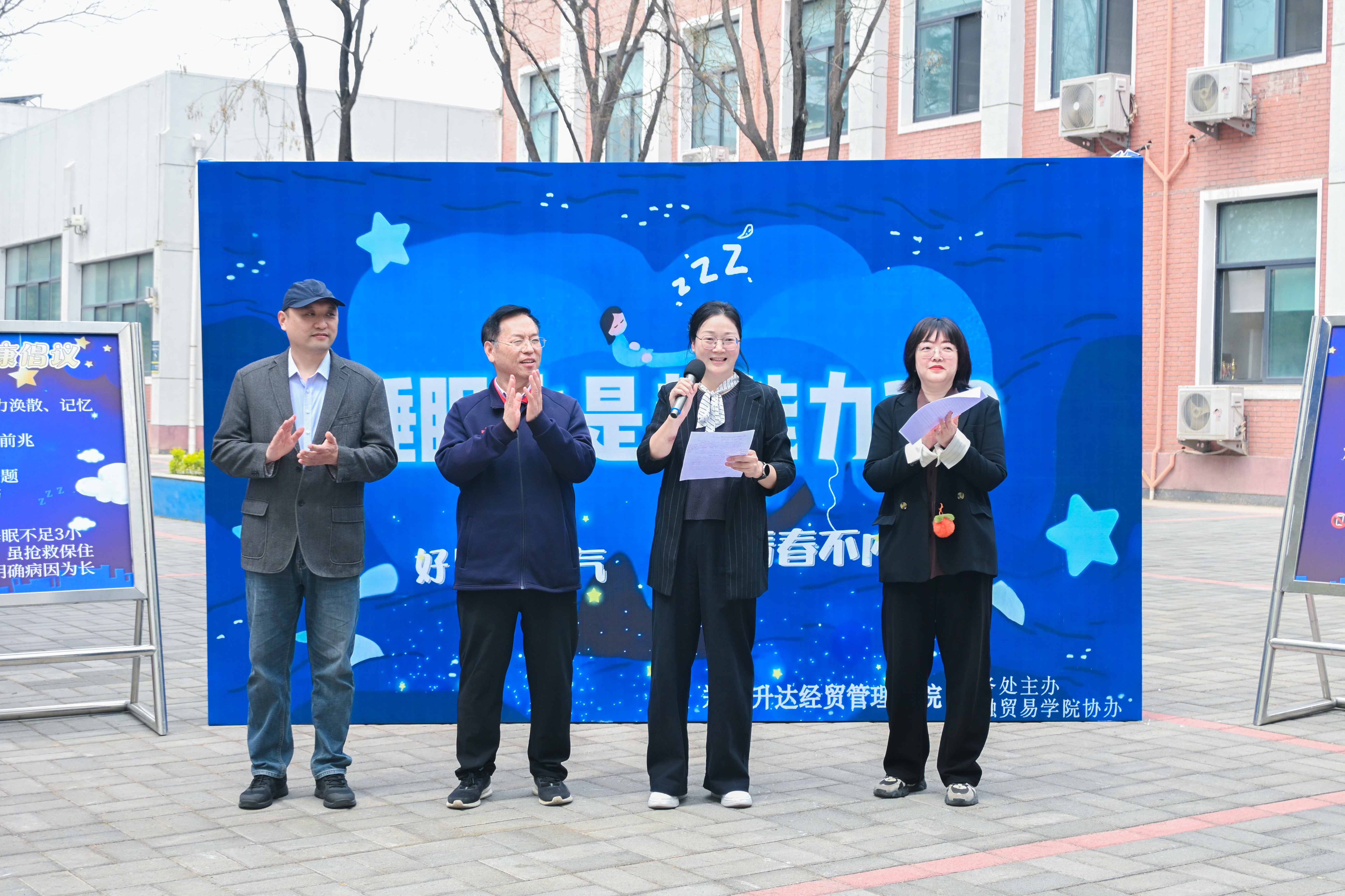 4月2日中午,2号楼广场化身“好眠能量站”,由学务处主办、金融贸易学院承办的“睡眠也是超能力2.0”主题活动在此正式启动。校党委副书记、副校长张金安,党委学工部部长孙鹏,金融贸易学院党委书记张小雁、党委副书记王娟出席活动,与现场千余名师生共同开启一场关于“睡眠与青春”的对话。